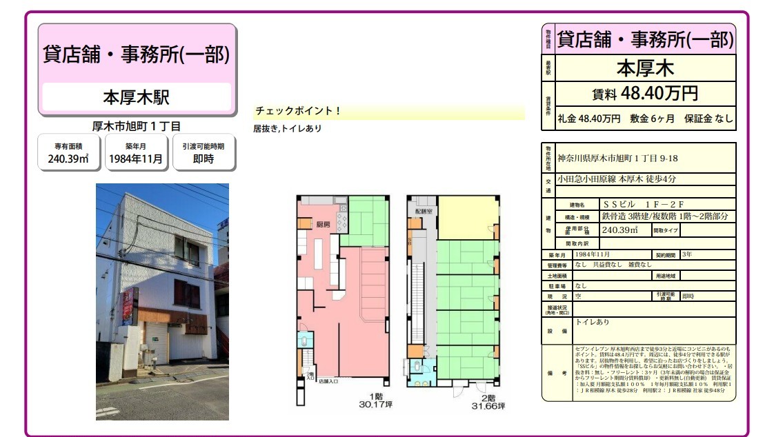 テナント.bizでは、厚木市旭町1-9-18をはじめ、東京・神奈川・千葉・埼玉・横浜・川崎等、首都圏を中心に賃貸事務所・賃貸オフィス・貸店舗・レンタルオフィス・貸ビル・新築貸事務所の情報満載です。 厚木市旭町1-9-18のショールーム・営業所・リース店舗や物販の貸事務所・賃貸オフィスも簡単検索できます。 厚木市旭町1-9-18でSOHOの貸事務所から100坪以上の賃貸事務所・賃貸店舗まで、物件数No1のテナント.bizにお任せ下さい。 その他、厚木市旭町1-9-18に貸事務所・貸店舗・貸ビルを所有のオーナー様には物件登録システムで無料にて貸事務所・貸店舗・賃貸オフィスの広告を掲載致します。 貸事務所・貸店舗の移転手続き、オフィスのレイアウトから内装工事のサポートも万全です。 事務所、店舗の他、貸倉庫、貸工場もテナント.bizにお任せ下さい。 |