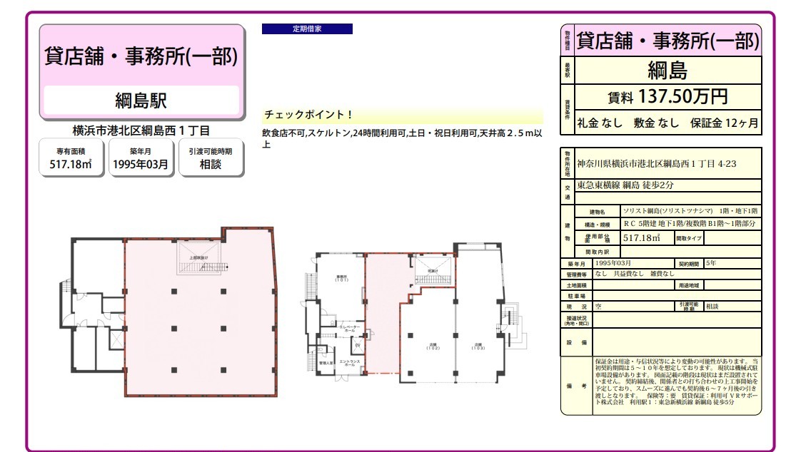 備考 | 飲食店不可スケルトン24時間利用可土日・祝日利用可天井高2.5m以上 条件交渉ご相談ください。 |