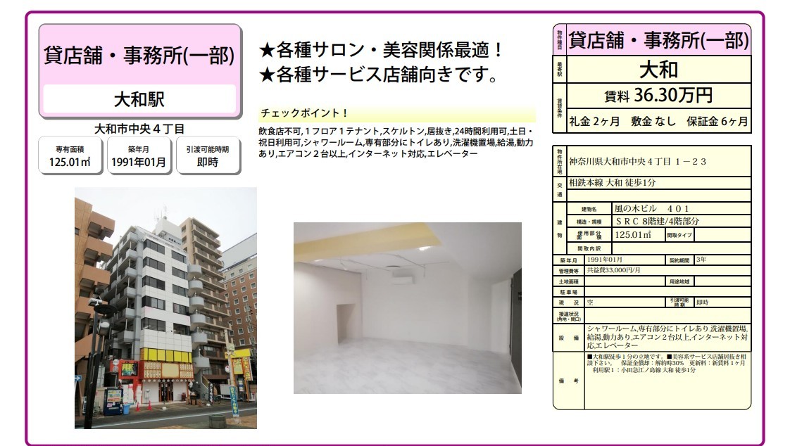トップページ > 物件検索 > 神奈川県大和市 の貸事務所・貸店舗 > 大和の貸事務所・貸店舗 > 大和市中央4-1-23 風の木ビル