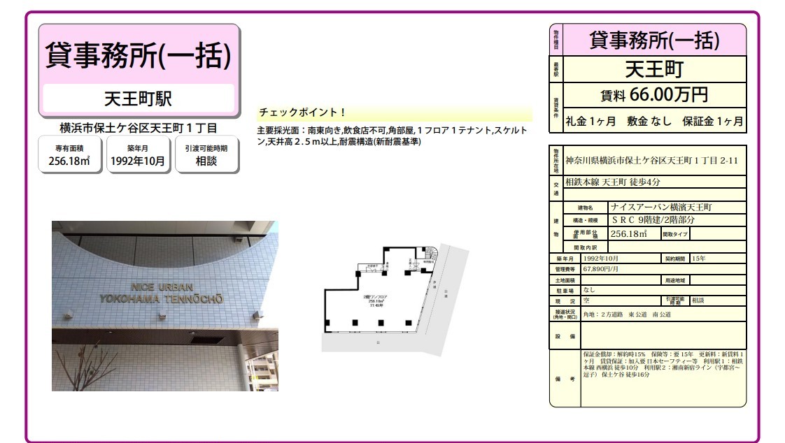 | 備考 | 飲食店不可角部屋1フロア1テナントスケルトン天井高2.5m以上耐震構造(新耐震基準) 条件交渉ご相談ください。 |