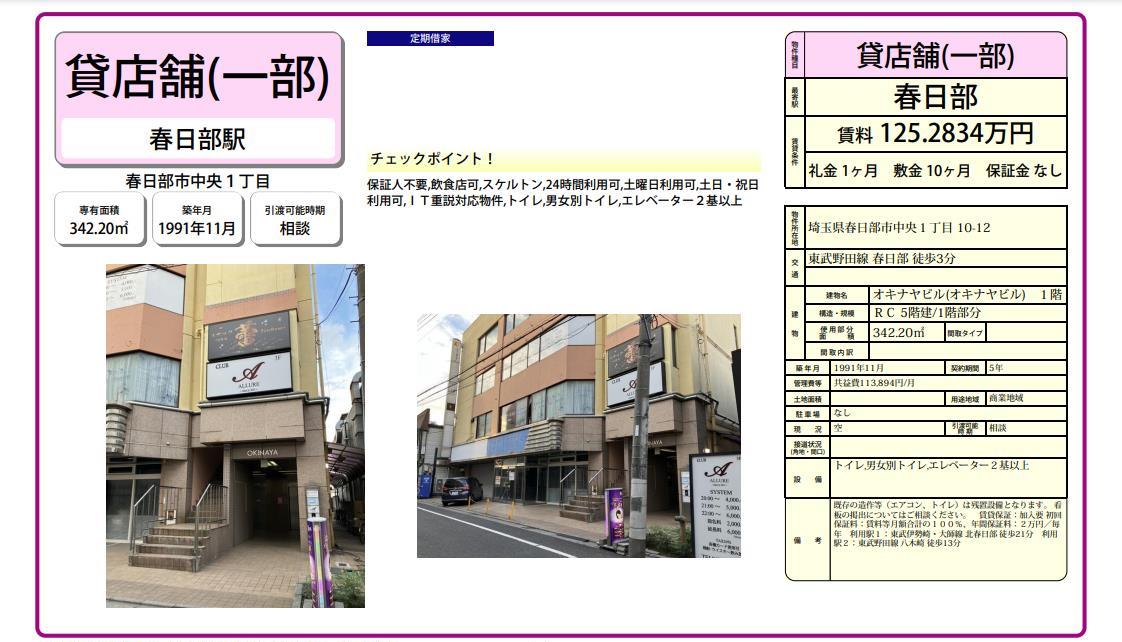 | 備考 | 保証人不要飲食店可スケルトン24時間利用可土曜日利用可土日・祝日利用可IT重説対応物件 条件交渉ご相談ください。 |