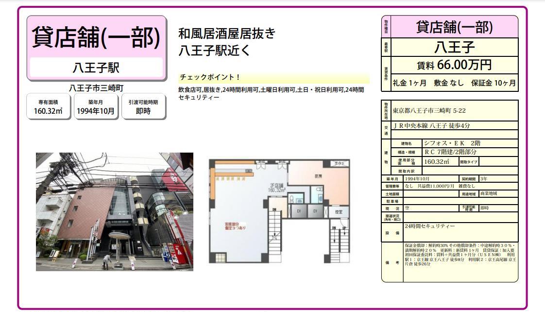 | 備考 | 飲食店可居抜き24時間利用可土曜日利用可土日・祝日利用可 条件交渉ご相談ください。 |