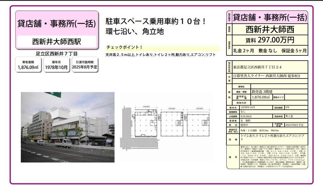 動力ありエアコンリフト ★環七沿い、角立地の一棟貸ビル★日暮里舎人ライナー「西新井大師西駅」徒歩8分!★環状7号線沿い交通アクセス便利!★駐車スペース乗用車約10台!★屋上広告塔あり!★建物面積詳細1階:615.6?(186.21坪)、2階:628.8?(190.21坪)、3階:556.8?(168.43坪)、その他:74.89?(22.65坪)、合計1876.09?(567.5坪)★諸条件ご相談ください!※図面と現況が異なる場合は現況を優先させていただきます。※保証会社・火災保険要加入※キュービクル、エアコン、リフト(500kg)、その他諸設備は全て残置物扱いとします
