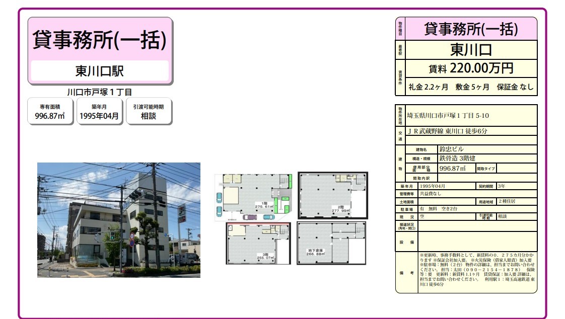 | 賃料(坪・円) | 坪 7,296 円 (総額 2,200,000 円) |