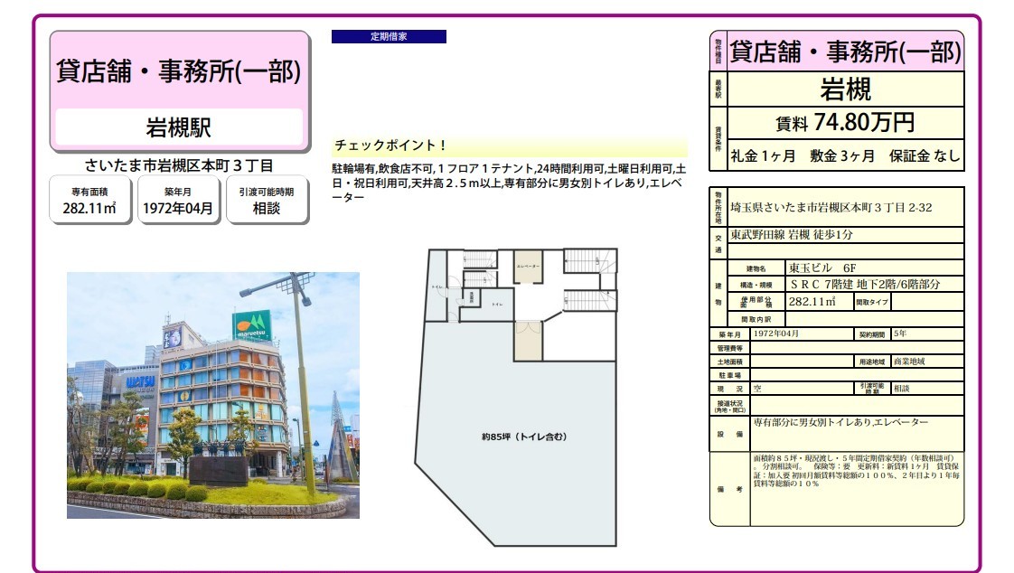 | 備考 | 飲食店不可1フロア1テナント24時間利用可土曜日利用可土日・祝日利用可天井高2.5m以上 条件交渉ご相談ください。 |